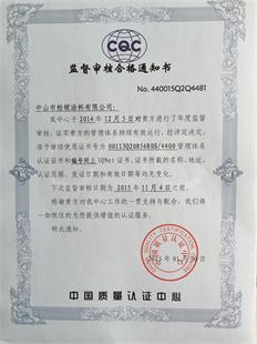 中山市柏頓涂料有限公司收到由中國質量認證中心頒發的ISO9001-2008年度審核合格證明。
